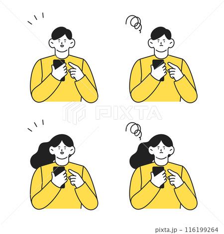 使用智慧型手機的男性和女性,兩種面部表情,積極和消極,插圖集