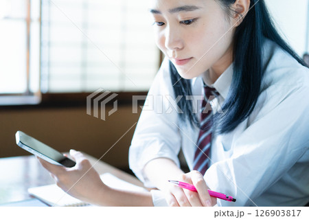 一名高中女生正在家裡用智慧型手機學習