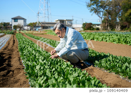一名男子檢查農作物(菠菜)的生長情況