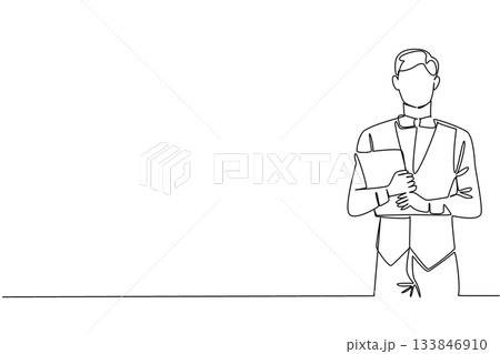 Single continuous line drawing a waiter crosses his arms in front of his chest while carrying a menu. Bringing menu list. Catalog. Servant. National Waiters Day. One line design vector illustration