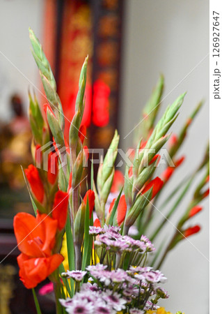 紅色劍蘭與粉紫雛菊的祭祀花藝擺設