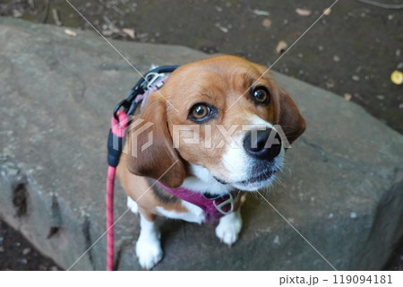 狗比格犬抬頭看著石頭