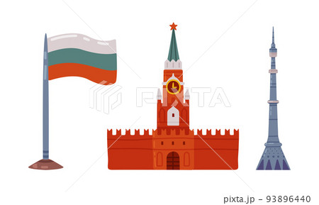 Moscow Kremlin, Ostankino Television Tower and Flag on Pole as Russian Symbol Vector Set