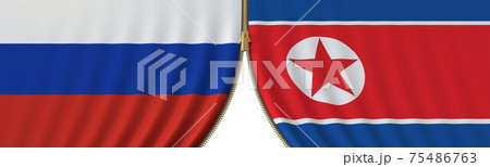 Flags of Russia and North Korea and closing or opening zipper between them. Political negotiations or interaction conceptual 3D rendering