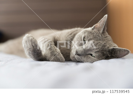 俄羅斯藍小貓,伸個懶腰,看起來很舒服