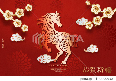 Happy Chinese new year golden red relief horse spiral cloud and plum blossom flower. Chinese translation : New year of horse