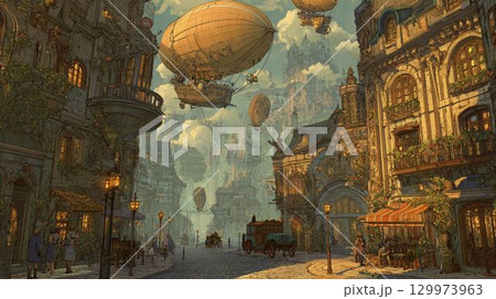 一座奇妙的蒸氣龐克城市和一群飛艇