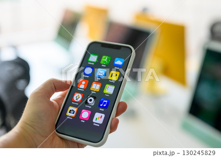 一名男子手持智慧型手機(螢幕是為拍攝而製作的原創畫面)