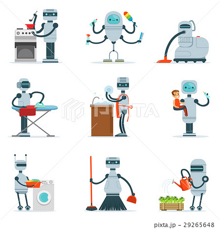 Robot housekeepers. Android character cleaning home, makes bed, walks dog, ironing, sitting with child, delivery parcel. Digital technologies, recent vector set