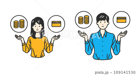 付款方式的選擇 - 表示一次性付款和分期付款之間的平衡的人的插圖