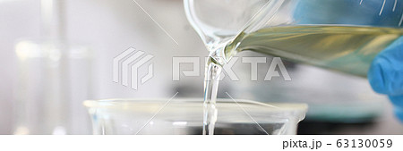 Scientist arm wearing blue protective gloves pouring yellow liquid at laboratory flask