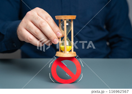 A man crushes a prohibition sign with an hourglass. Concept of lifting prohibitions and restrictions due to expiration of time, irrelevance. Review laws, regulations. Liberalization and legalization.