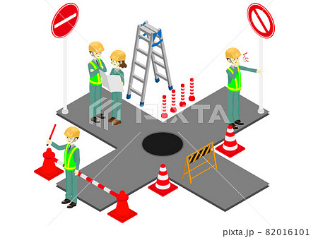 施工招牌 施工期間男性現場工人以反光棒和資訊招牌進行指導的插圖圖示素材