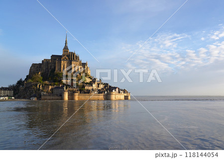 Mont Saint-Michel view in the sunrise light. Normandy, northern France