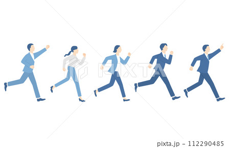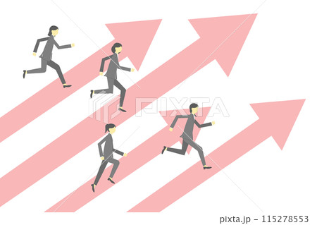 業務業績正在上升。四個人沿著紅色箭頭跑。這是一幅商業人士奔向成長的插畫。