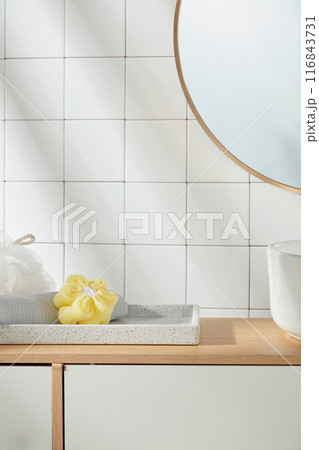 The creative template photo was taken from the front against the white checkered tile wall in the bathroom. There is a mirror hanging on the wall, product displaying tray placed on wooden cabinet