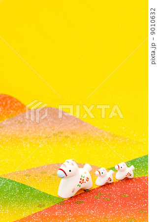 白馬一家人坐在墊子上互相問候。新年用品和新年賀卡。