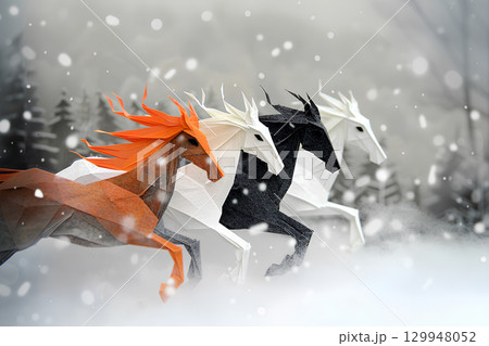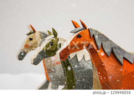 三匹小馬駒在牧場玩耍(馬年、十二生肖、新年賀卡材料)