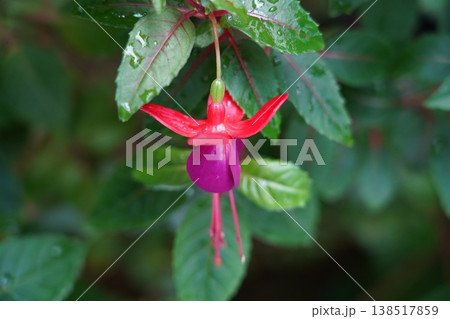 Vibrant flowers with striking red purple hues, with water droplets. The beauty of fuchsia blooms, their wet petals a red and purple. The droplets of water add a fresh, natural feel to autumnal scene.