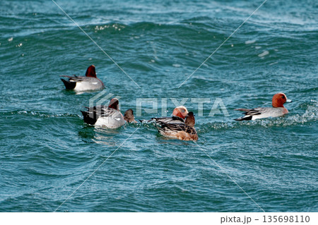 一群雄性赤頸鴨和雄性針尾鴨