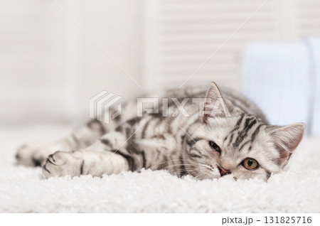 Relaxed snowshoe cat lying isolated on white background and looking to the camera