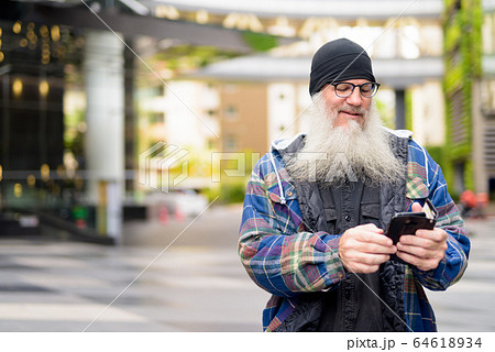 Happy mature bearded hipster man using phone in the city streets outdoors