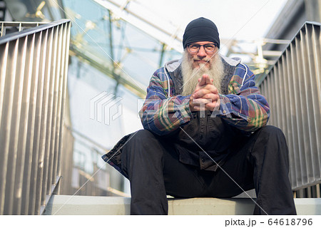 Mature bearded hipster man with eyeglasses at footbridge in the city