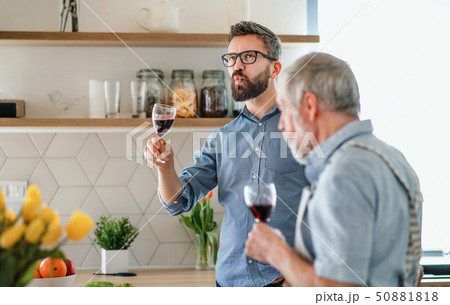 An adult hipster son and senior father indoors in kithcen at home, tasting wine.