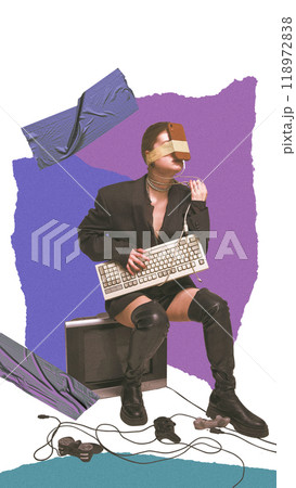 Woman blindfolded with smartphone strapped to her face, holding keyboard. Humorous take on 90s tech and modern digital overload. Contemporary art collage.