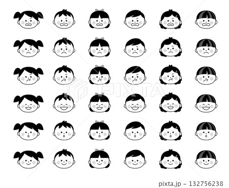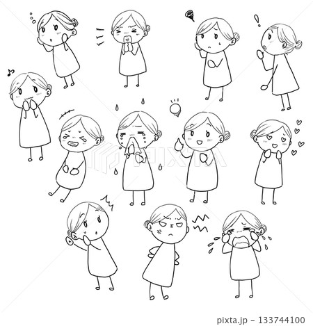 可愛又輕鬆的女性迷你角色插畫。多種面部表情。黑白單色。