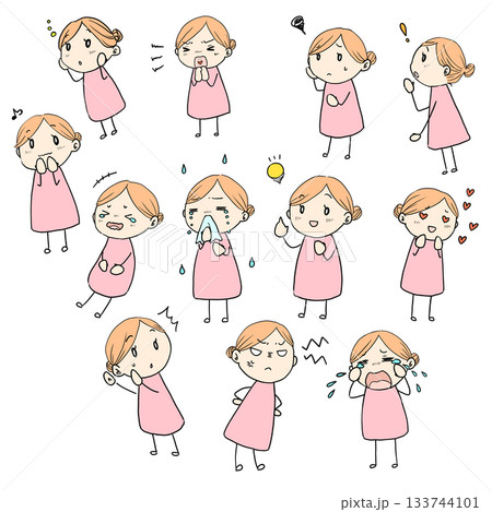 輕鬆可愛的女性迷你角色插畫。多種面部表情。彩色。