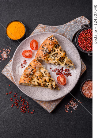 French quiche with chicken or salmon, cheese, salt, spices and herbs