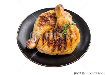 Roasted chicken legs in a plate, grilled eco poultry meat isolated on white background