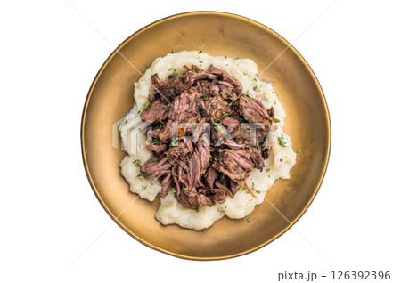 Homemade French Beef Bourguignon Stew on a plate with mashed potatoes isolated on a white background. top view