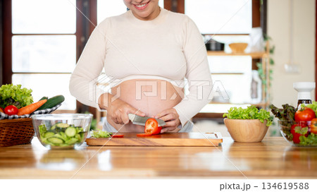 Close up of pregnant woman holding knife cutting tomato on chopping board making salad in kitchen