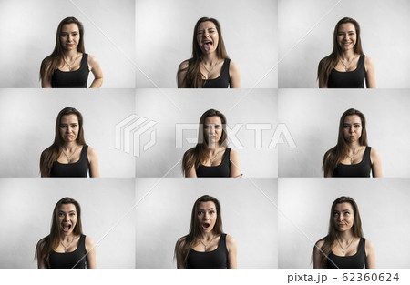 Set of young woman's portraits with different emotions. Young beautiful cute girl showing different emotions. Laughing, smiling, anger, suspicion, fear, surprise.