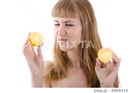 Beautiful young girl holding a sour lemon isolated