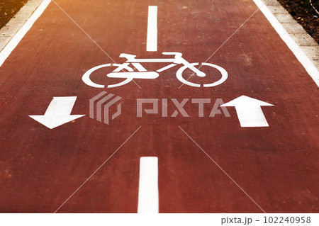 New marking bike path. White bicycle symbol and two oposite arrows on red asphalt lane, road. Bicycle path in the city. Two-way cycle lane on an avenue. Lifestyle. Urban traffic and transportation