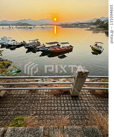 Boats moored at a tranquil harbor during a serene golden hour sunset