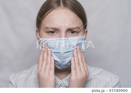 Close-up, teenager girl in medical mask, hands holding mask, looking at camera. Emotions anxiety experiences for loved. White background. Feeling unwell. Stay home during coronovirus pandemic.