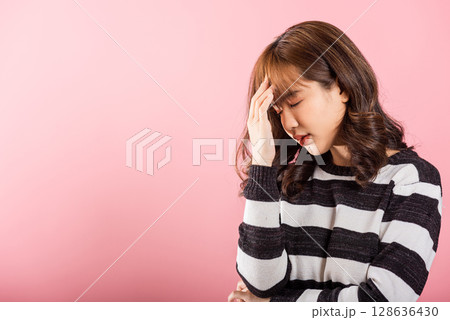 Portrait of beautiful Asian young woman sad tired strain face holding hold head by hands, female person closed eyes problem she headache, studio shot isolated on pink background