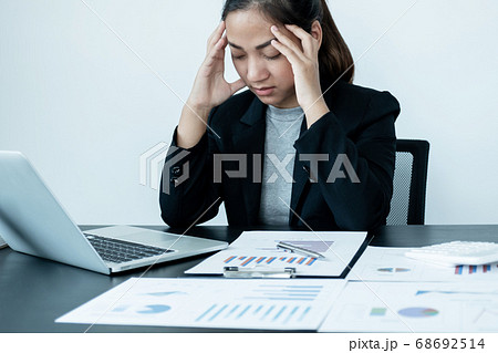 Asian woman wear white t-shirt feeling sick have headache with migraine headaches isolate on white background, With clipping path.