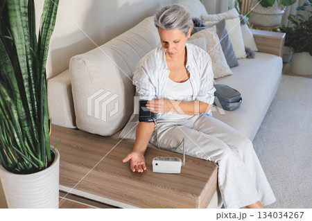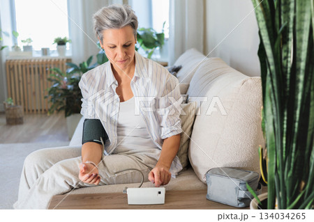 Mature beautiful middle-aged woman with gray hair sits on the sofa and measures blood pressure