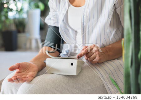 A middle-aged woman sits on the couch and measures her own blood pressure. Concept hypertension
