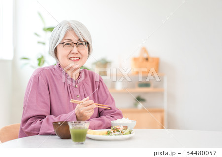 一位白髮老婦人在家裡的餐廳吃飯
