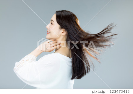 一位白髮女性抬頭的特寫,皮膚護理和美容形象,觸摸她的臉頰