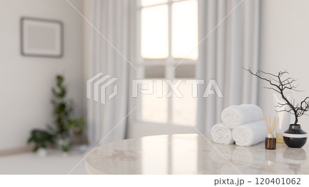 A luxury marble table features towels, a reed diffuser, and a ceramic vase in a luxury white room.