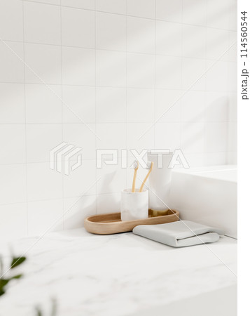 Toiletries and a presentation space on a white marble tabletop in a contemporary bathroom.