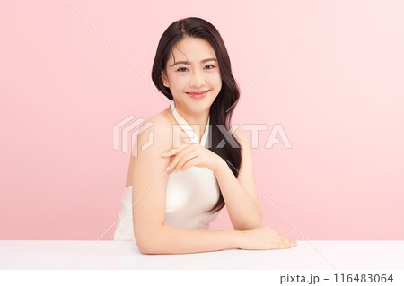 Beautiful young asian woman with clean fresh skin on pink background, Face care, Facial treatment, Cosmetology, beauty and spa, Asian women portrait.