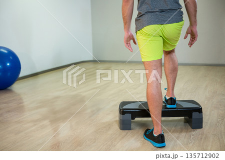 Man in neon shorts stepping onto platform in fitness studio with stability ball, copy space